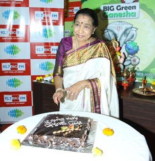 02nd September, 2014Popular and melodious songster, Asha Bhosle, who is remembered for her contribution to the Indian music industry for some of the most popular hits of all time, visited the 92.7 BIG FM office to perform the Ganpati aarti. While she performed the aarti harmoniously along with everyone at the radio station, the employees had a little surprise planned for the marvelous singer. They brought in her birthday with a delicious birthday cake and celebrated her birthday in the office as well as on-air.